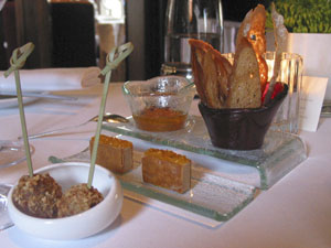 A few snacks were brought out to accompany the aperitif: squid fritters, foie gras with orange marmalade, and smoky tomato and olive spread with toasted bread. I’d never have thought of combining foie gras with marmalade but the combination worked well.