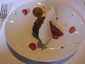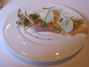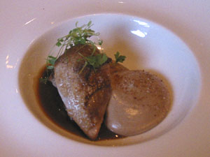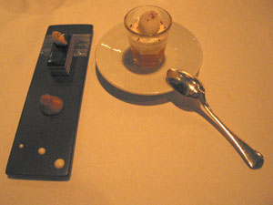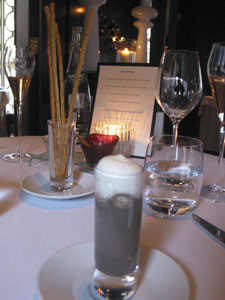 The amuse-bouche was a mushroom veloute with a truffle mousse on top. The presentation was very topical – it was the week when the volcanic ash from Iceland caused widespread disruption in Europe. The soup was smooth and rich in flavour – this was a promising start.