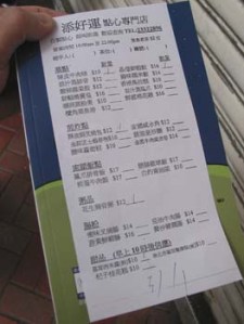As the restaurant can only hold 20 customers at a time, a member of staff strolled down the queue to give out numbers and jot down the number of people in each group. The couple in front of me, numbered 30, was told that they would have to wait for at a very minimum of 1 hour and they should go for a walk in the neighbourhood and return in an hour. I was the only person in my group no. 31, and I was told that I should stay in the queue in case I could join another table and jump the queue. I was handed over a piece of paper with all the dim sum dishes, and I marked a few dishes that I fancied trying.