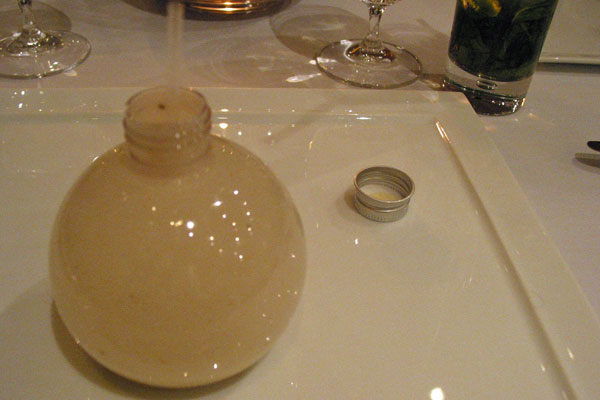 The amuse bouche was spiced potato velouté, which came in this screw-top bulb-shaped bottle, and a thin straw was provided to sip the veloute out of this bottle. Unfortunately due to the thickness of the veloute, it was rather difficult to suck anything through the straw. The soup itself was fine, but the whole idea of the bottle and straw was verging on being too gimmicky/tacky – in fact Bob made a comment “I can eat from a plastic cup at 7-11”. Whoops! That’s not a good start.