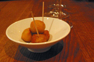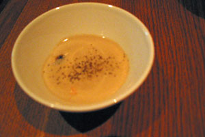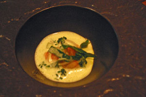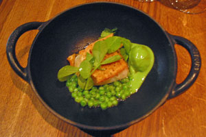 Our first course was mushroom soup with mushroom ketchup and powder, served with pigs head croquette cubes and the round smoked haddock fritters. The soup had a very intense pleasant mushroom flavour – it was a promising start to the meal.
