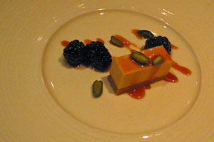 The final course was sea buckthorn mousse with blackberries, pistachio and sea buckthorn caramel. The base was good, and the various ingredients worked well together in the dish – an absolutely lovely way to finish this rather memorable dinner.