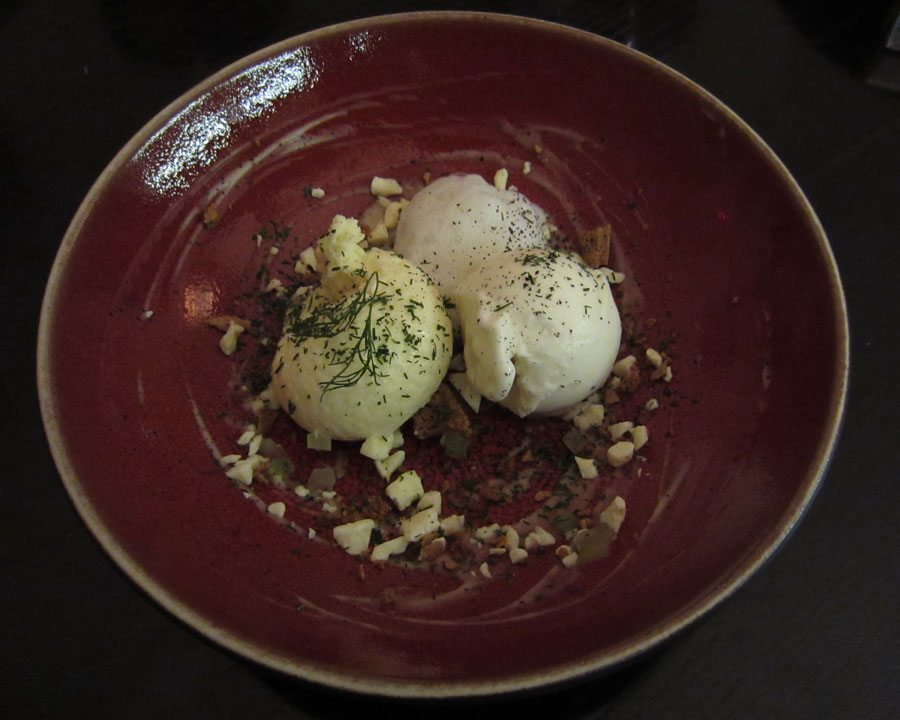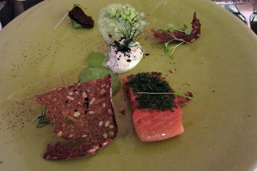 The next course was smoked organic salmon (graflax) with horseradish. The salmon was lightly cooked and the flesh was still firm, contrasting well with the soft mousse and the crisp bread that accompanied the dish. It was a very promising start, and Titus was already happy.