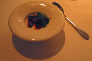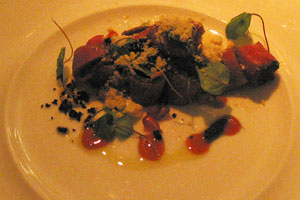 The amuse bouche was goat cheese mousse with beetroot ice-cream and rocket. It was a good balance of flavours in the goat cheese and beetroot, however there was probably a little too much goat cheese but not enough beetroot.