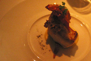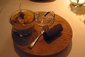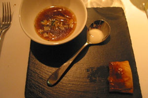 The celeriac consommé (with partridge turnover and sage) had an intense sweet flavour, though this was somewhat spoilt by the soggy pastry on the partridge turnover. The partridge meat was a little dry also.