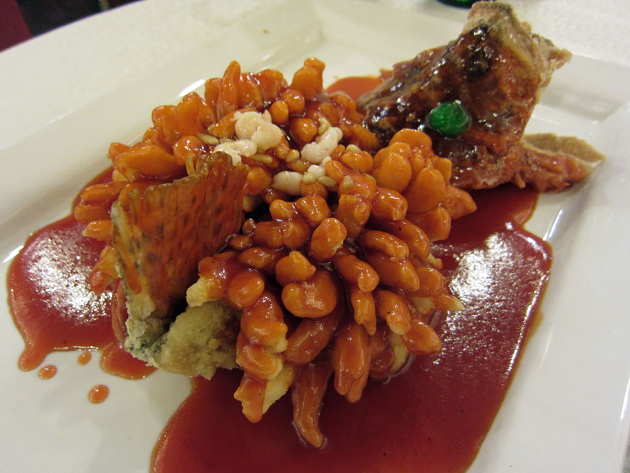 We also ordered another Suzhou classic dish – Squirrel Fish. This was not a new species of fish; instead it’s a fish that’s been deboned, fried and shaped like a squirrel. There’s more information about the origin of Squirrel Fish on the web. The dish was beautifully presented, but with a more sweet and very little sour flavour. This is not unusual though for this region. To accompany these two rather rich-flavoured dishes, we had a mixture of four vegetables which was a good dish though the pool of oily soy sauce was slightly less welcoming.