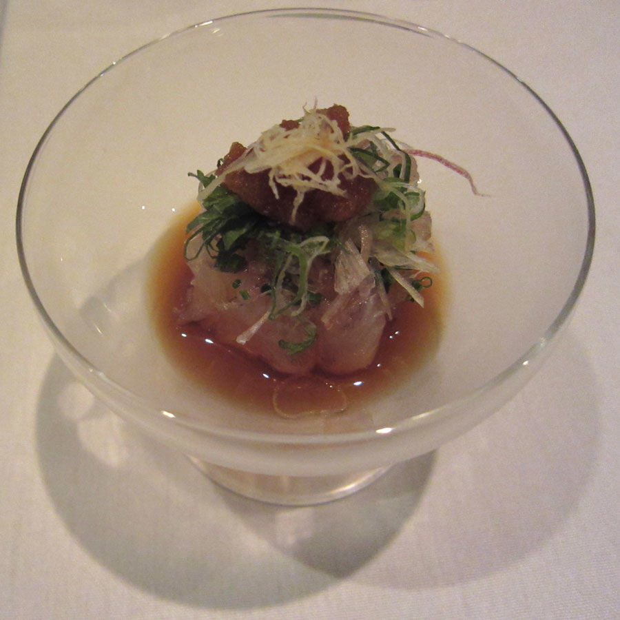 (1) Fluke Ponzu (Thinly sliced fluke with chive, shiso leaf, ginger shoots, scallion, under mizore ponzu sauce) was fresh and worked well with the citrousy ponzu sauce.