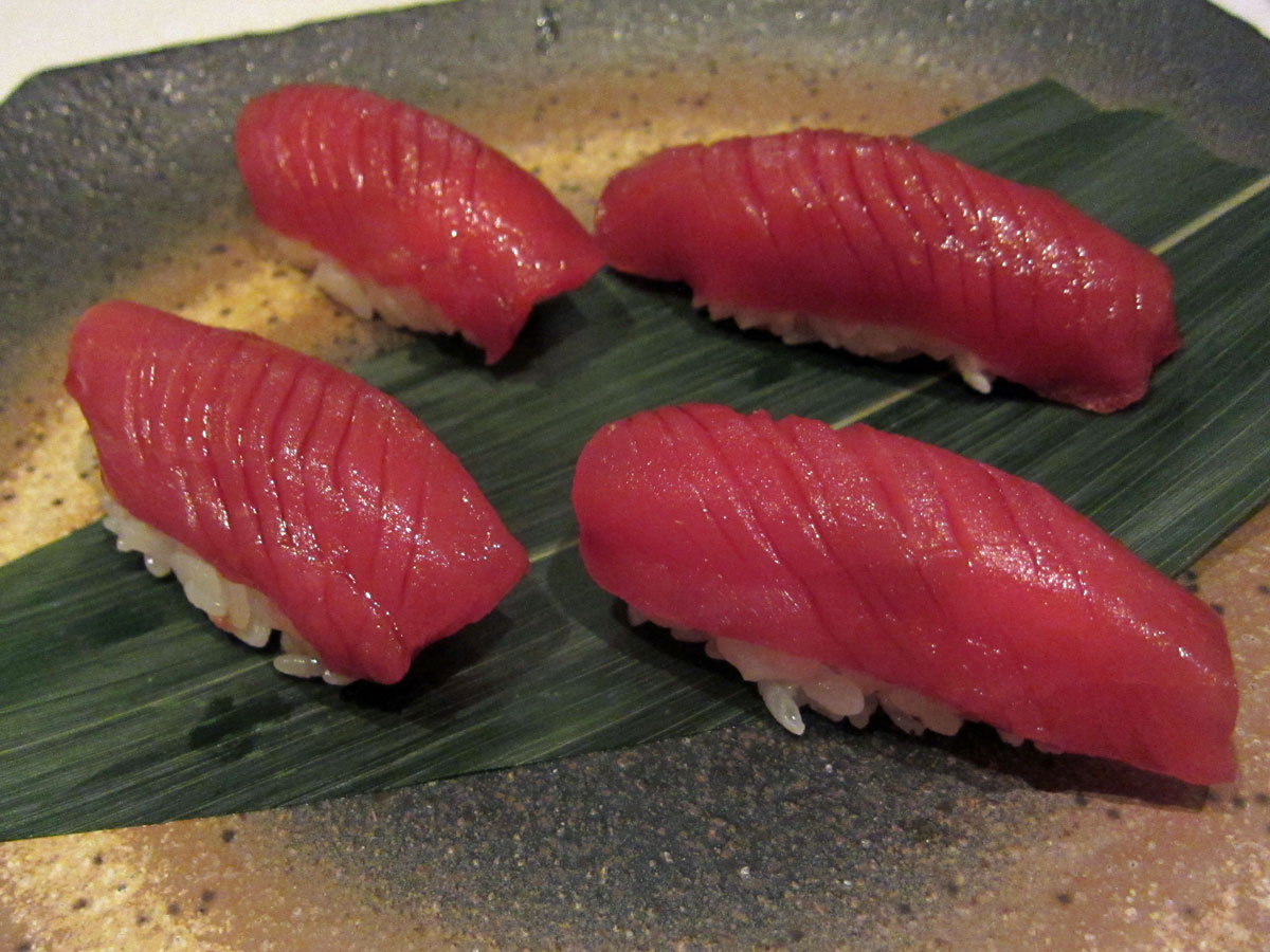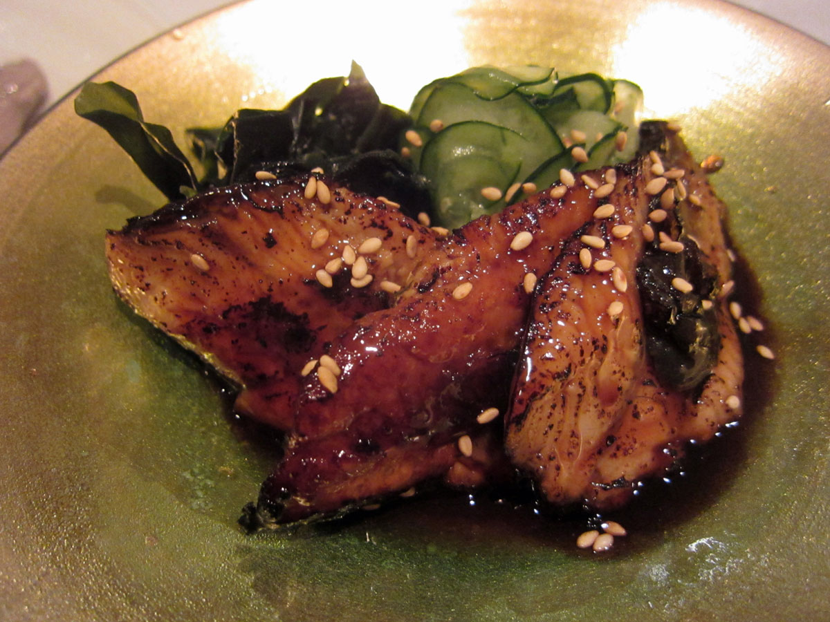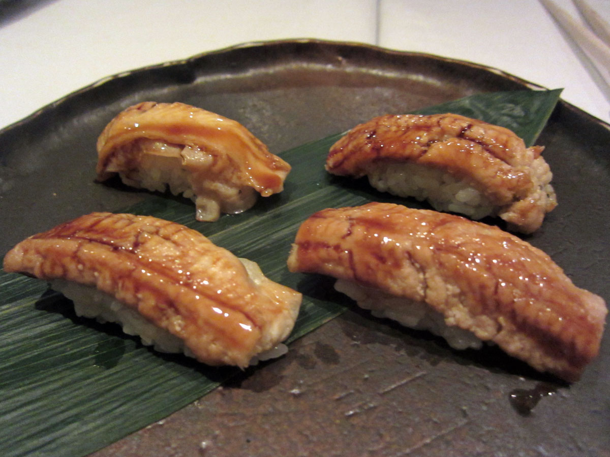 (13) We also had a few pieces of nigiri sushi: Maguro (blue fin tuna from Massachusetts) and Zuwaigani (snow crab from Nova Scotia) were good but not that impressive, while the Anago (sea eel from Nagasaki) had a very slick texture and was absolutely delicious.