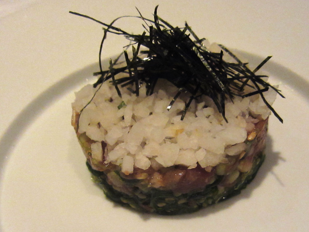 (8) Tuna Tartare ( Chopped big eye tuna with pine nuts, asian pear, cucumber, scallion, sesame seed in spicy sesame sauce) was like a fish version of the Korean Yuk Hwe (raw beef), and it was delicious with a nice hint of spiciness.